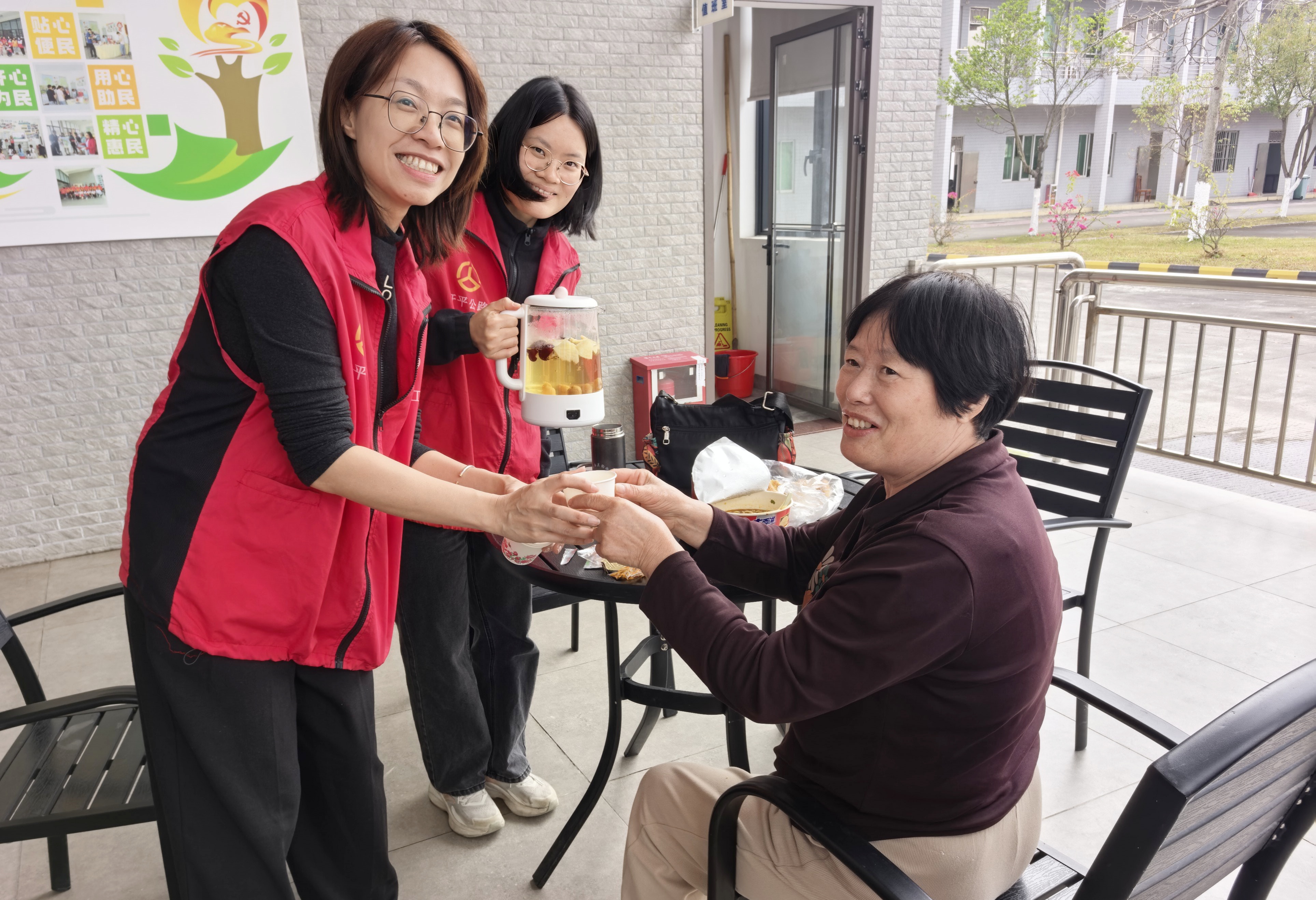 办事区里意愿红 情满旅途暖。